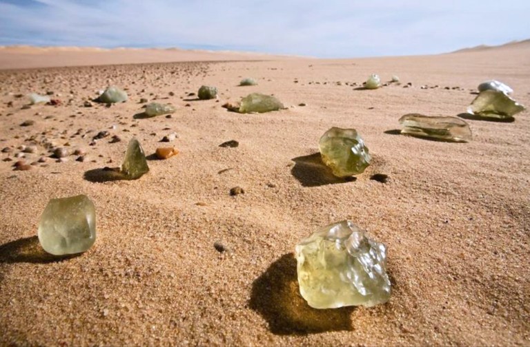 노란색, 녹색 또는 노란녹색 색상의 이 반투명 자연 유리는 사하라의 일부인 리비아 사막 한 곳에서만 발견된다.