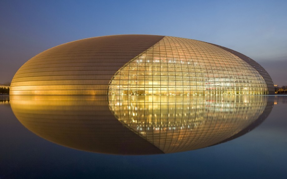 Built for the 2008 Summer Olympics, the sparkling dome that looks like it is floating on a lake contains an opera house, concert hall