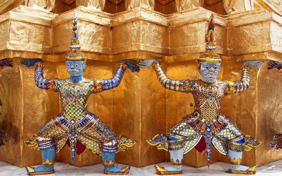 As befits a former royal residence, the Great Palace of Wat Phra Kaew dazzles with its shimmering walls and pediments, covered with gilding and colored glass mosaics.