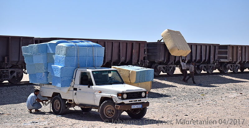 Nuadhibou로 향하는 서쪽으로 여행할 때 각차는 최대 84톤의 철광석을 운반 할 수 있다.