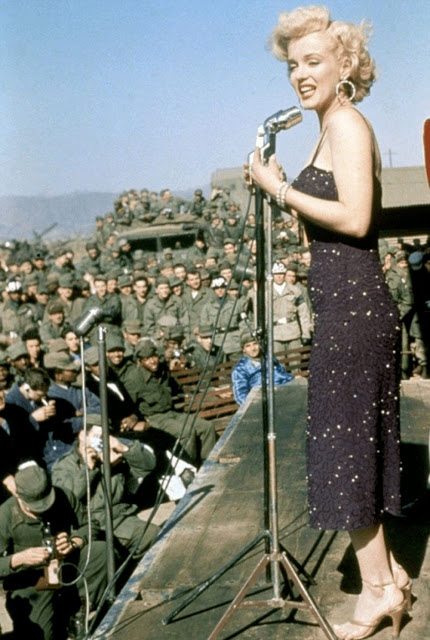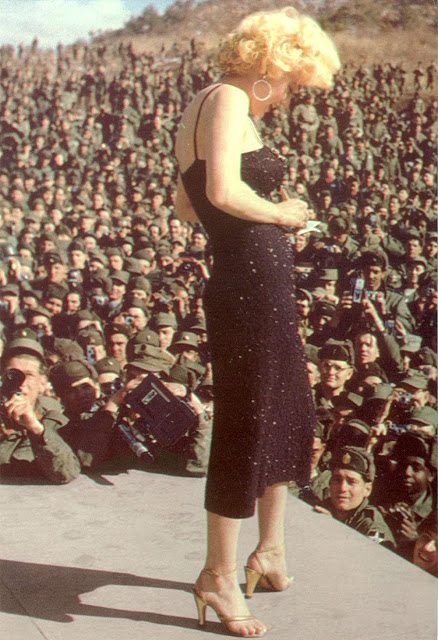 1954년 2월 22일 Marilyn Monroe가 4일간의 한국 투어 첫 공연에서 미군 병사들 앞에서 노래하는 사진.