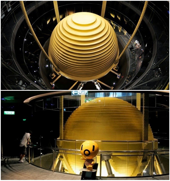 그것은 초고층의 동요를 줄이기 위해 바람과 지진과 같은 큰 일시적인 부하에 저항하는 거대한 금속 공이다.
