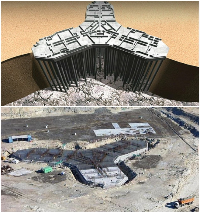 이 결과는 대규모 준비 작업과 대규모 지진 및 지질 공학 연구에 선행되어 복잡한 기초 및 지원 시스템을 구성하는 데