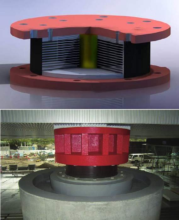 메인 구조와 기본 기초 시스템 사이의 간격은 독특한 에너지 방출 및 연화특성을 가진 납 고무 베어링 (LRB)으로 구성된다.