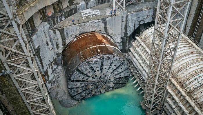 오늘날 강력한 터널보링기계는 바위 지하로 뚫고 있으며 뚫는 직경은 해마다 확대되고 있다.기계의 크기는 인상적인