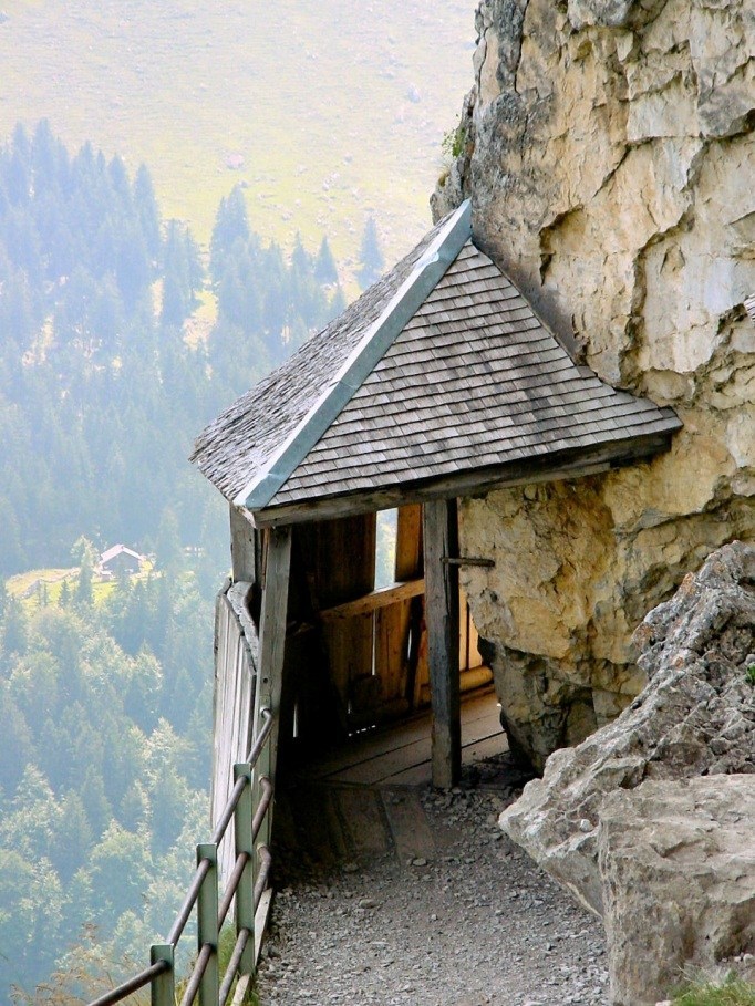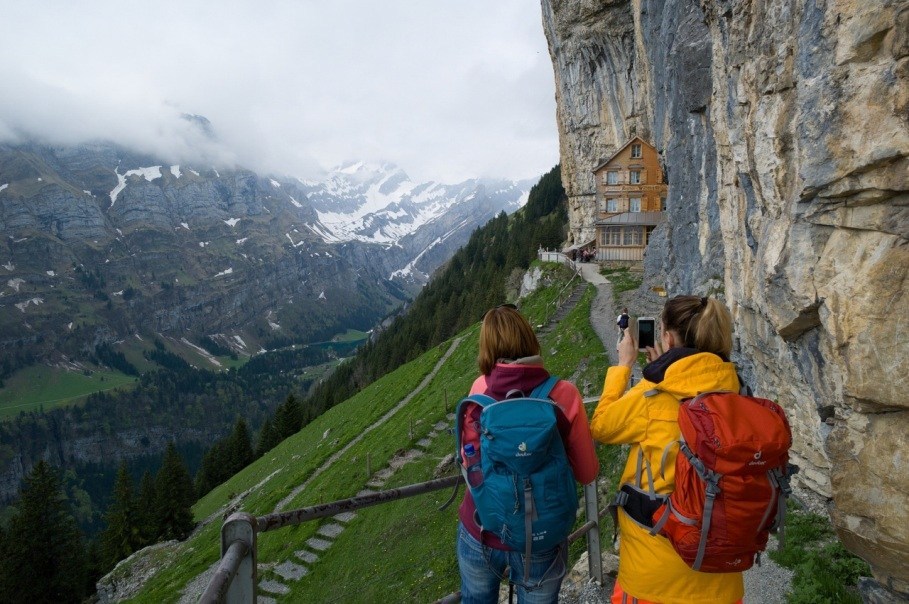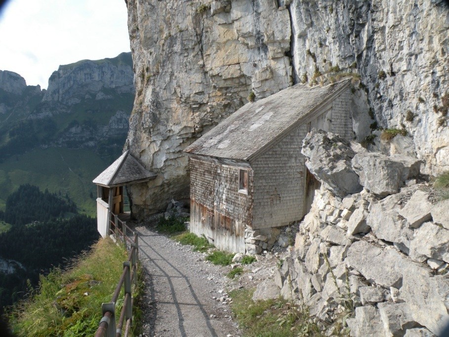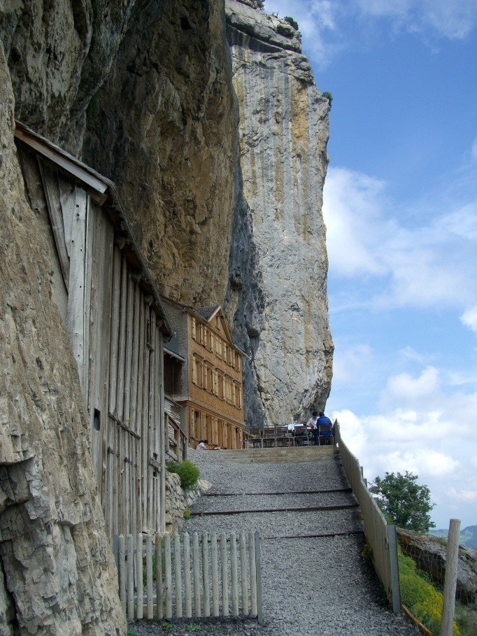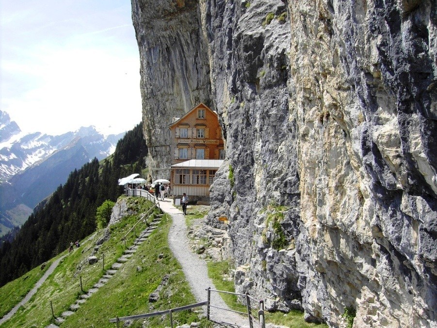 Swiss Alps산맥 산속의 높은 곳에 Berggasthaus Aescher가 있다. 이 산악 호텔은 자연 그대로의 자연의 아름다움을 감상하고 알프스에서 가장 멋진 지역 중 하나를 보기 위해 여행하는 사람들을 위한 호텔이다. 이 호텔은 가파른 절벽의 경사면에 서 있으며 케이블카 또는 산악 도로로만 이곳에 오를 수 있다. 이 호텔은 4월부터 10월까지 여름철에만 운영된다.