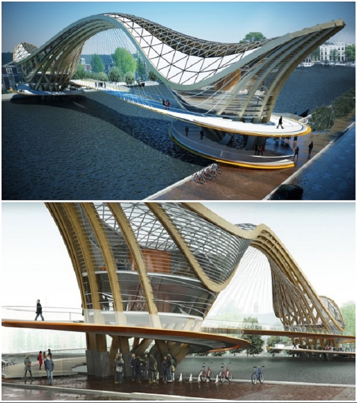 건축가 Laurent Saint Val과 그의 팀은 네덜란드 암스테르담의 다리에 대한 흥미로운 아이디어를 수집하기 위해 디자인 공모전의 일환으로 원래 보행자 다리 카페를 설계했다. Amsterdam Footbridge-Cafe의 컨셉은 케이터링 및 레크리에이션 공간과 결합되어 목재와 강철을