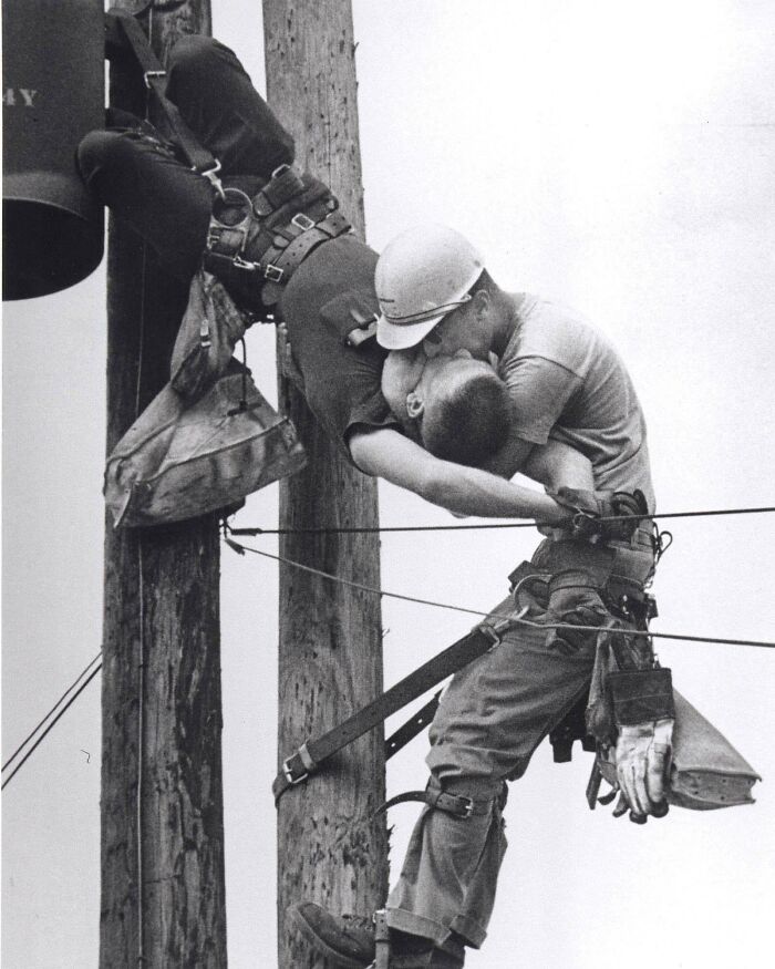 이 사진은 사진작가 로코 모라비토가 4,160볼트의 전기에 감전되여 안전 벨트에 거꾸로 매달려 있는 전기 기사를 구조하는 동안 매우 극적인 배경을 가지고 있었다. 그는 구급차를 불렀고 그 동안 다른 라인맨이 일어나서 입에서 입으로 동료를 성공적으로 구출했고, 모라비토가 그 곳에서 현장장면을 찍기 위해 그곳에 있었다.