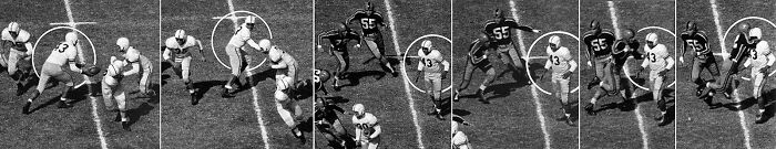 John Robinson 과 Don Ultang이 찍은 일련의 사진은 오클라호마 주 스틸워터에서 열린 미국 대학 축구 경기에서 아프리카계 미국인 선수 Johnny Bright와 관련된 인종적 긴장을 강조했다. 사진작가들은 그가 표적으로 삼았다는 수많은 소문에 따라 브라이트에 초점을 맞춘 카메라를 의도적으로 설치했다. 어떤 면에서는 1쿼터까지만 머물 계획이었는데, 브라이트가 상대팀에 세번이나 쓰러졌고 결국 팔꿈치 타격을 받아 턱을 부러뜨렸다.