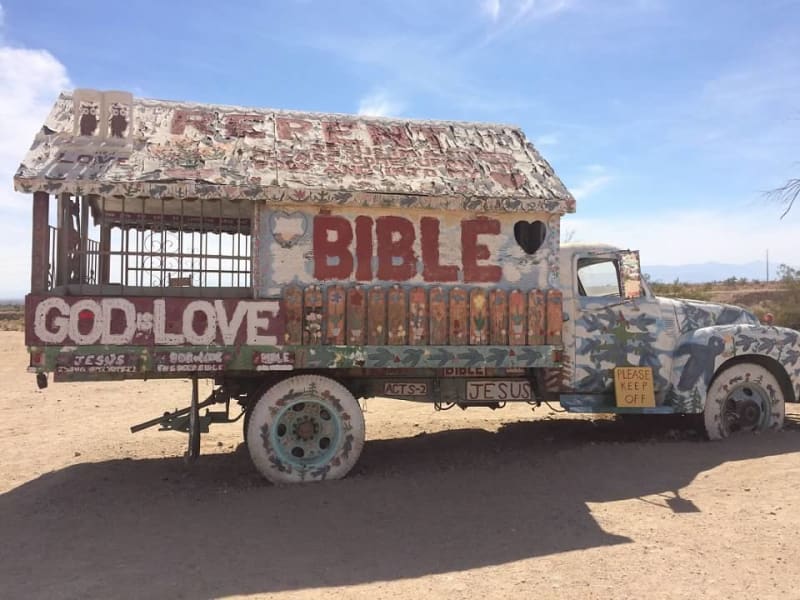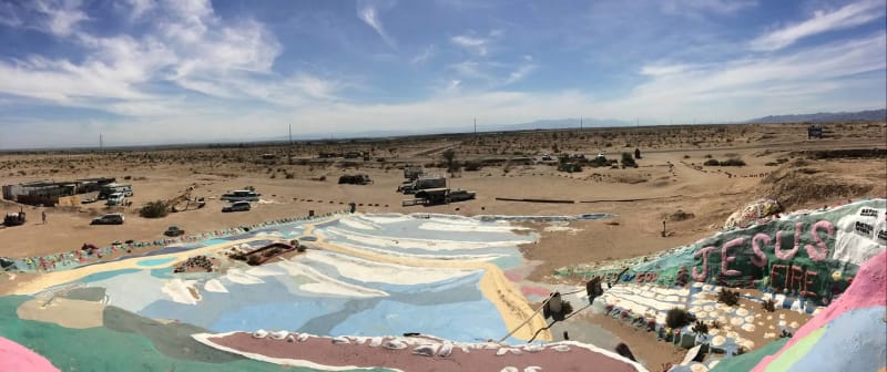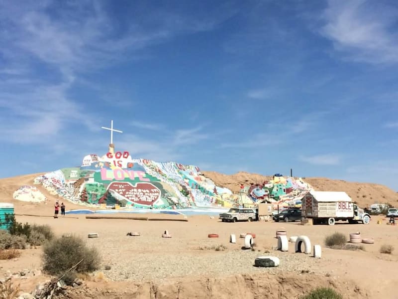 캘리포니아 남부 사막에는 숨겨져있는 멋진 예술작품과 규칙없는 커뮤니티가 있다. Mount Salvation은 이러한 설치구조중 가장 유명하다. 구원의 산을 무료로 방문하고 주변을 돌아 다니며 장식된 자동차, 인공 동굴 및 산 구조물을 감상 할 수 있다.