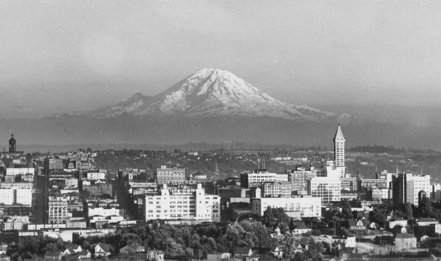 A view of Mount Rainier, with the buildings of Seattle, Washington, visible in the foreground. This photo was taken from Bigelow Avenue, near present-day Bhy Kracke Park. See the view today in Google Maps