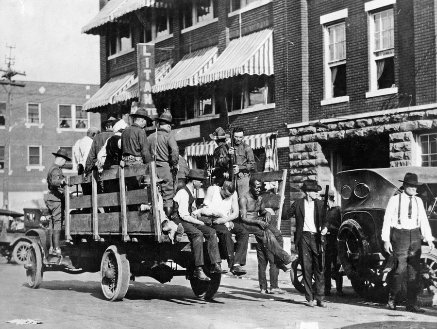 Injured and wounded men are taken to a hospital by National Guardsmen, following the Tulsa race massacre, in Tulsa, Oklahoma, June 3, 1921