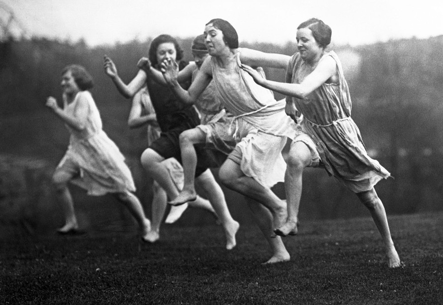 The original caption reads-Girls of University of Cincinnati Stage Grecian Games. Garbed in costumes of ancient Greece, fair students of the University of Cincinnati, Ohio, arranged a set of Grecian Games for the benefit of the University athletic fund. All of the girl students of the University, who take a great interest in outdoor games and athletics, took part in the games.