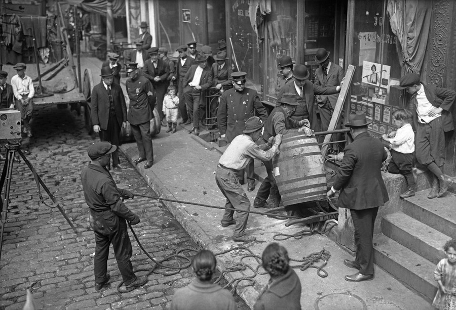The original caption from April 27, 1921 reads-New York, NY- Seizure of wine on a court warrant at 38 Cherry Street. Shows officials taking barrels from the cellar.Prohibition was in effect in the United States from 1920 to 1933.