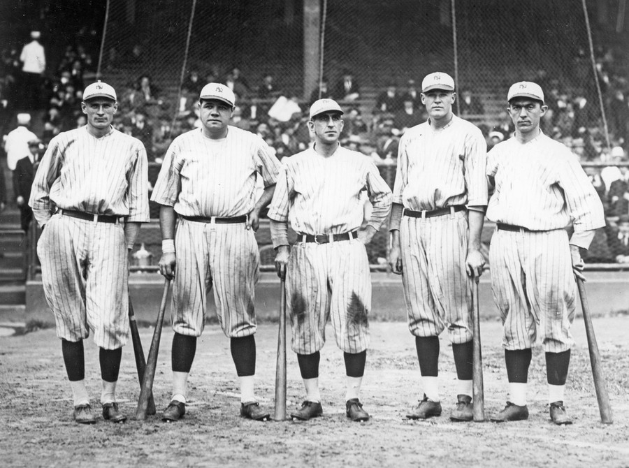 Murderer's Row (from left) Wally Pipp, Babe Ruth, Roger Peckinpaugh, Bob Meusel, and Frank Home Run Baker, of the New York Yankees, photographed in Yankee Stadium in 1921.