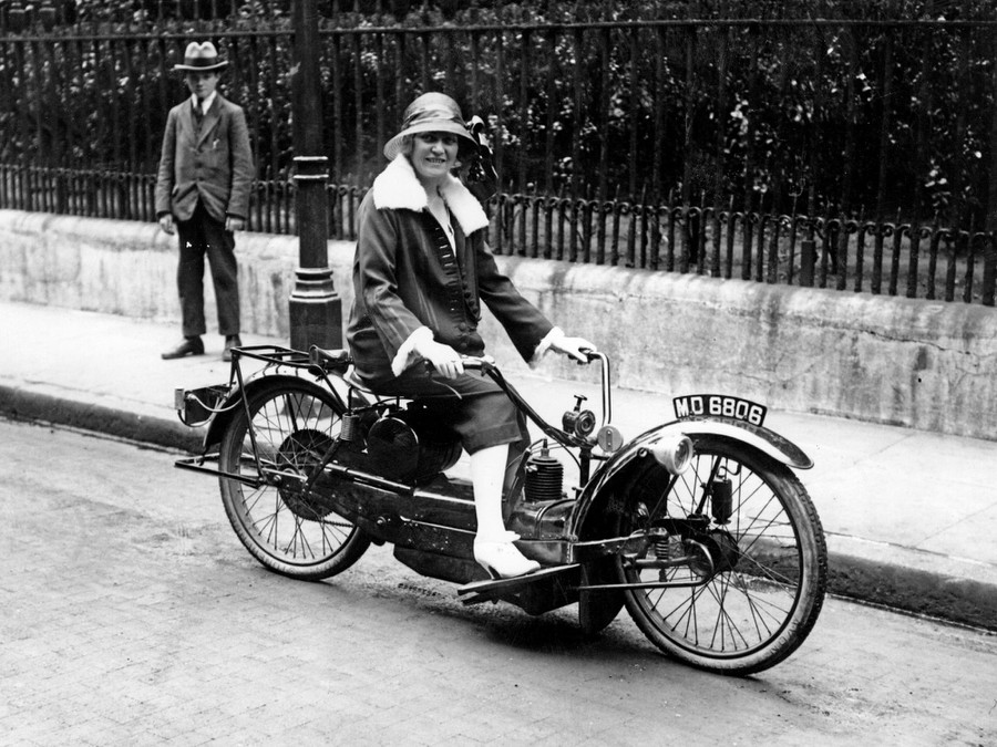 The actress Madge Saunders rides her Ner-A-Car motorcycle, somewhere in the U.K, circa 1921