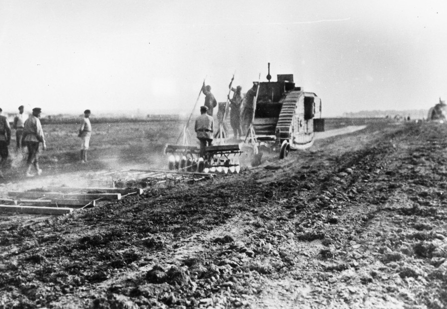 The original caption from 1921 reads-Russian agricultural workers plow a field with a captured British tank, after the Civil War decimated technical resources in Russian rural areas.