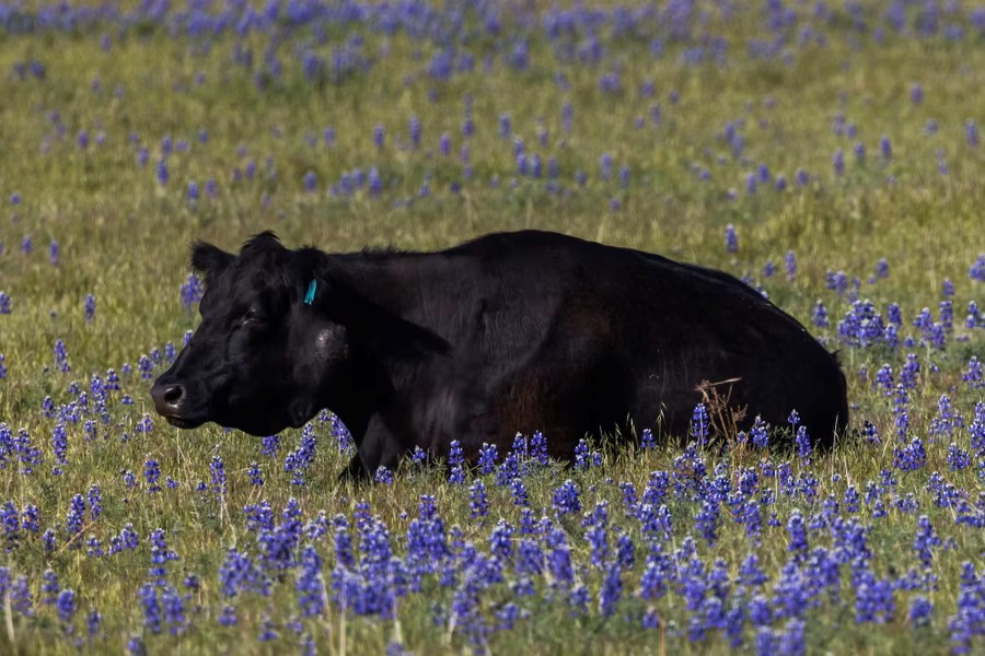 4.A cow lies among sky lupines (Lupinus nanus) as flowers start to bloom during a break between storms on March 13, 2023, near Wheeler Ridge, California.