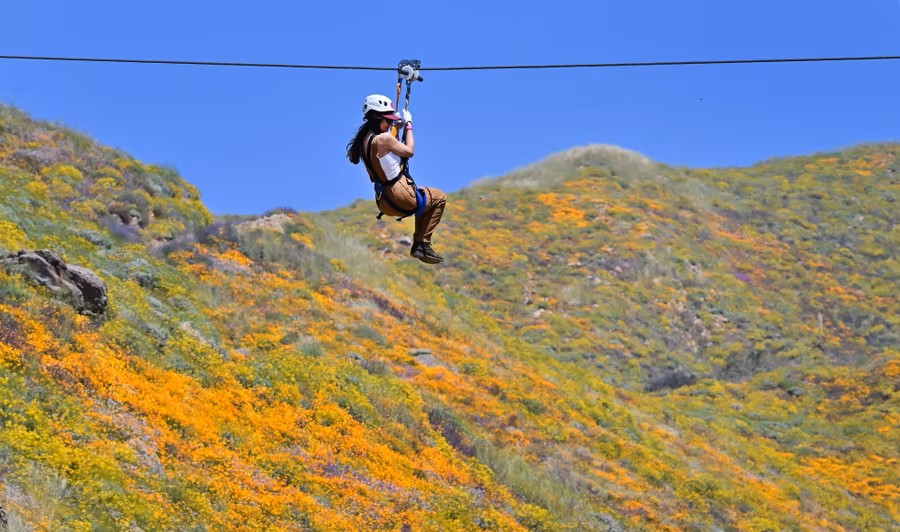 10.Lisa Mayer holds on while ziplining over blooming wildflowers at Skull Canyon Ziplines in Corona, on April 11, 2023