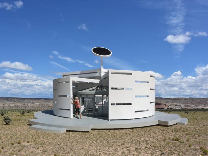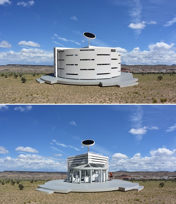 기발한 해결책: 회전형 Interactive Radius House는 유리와 강철로 만든 6미터 직경의 중앙 원통형 코어 주위를 이동할 수 있는 곡면 패널로 구성된