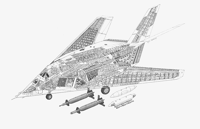 놀랍게도, 세계 최초의 연속 스텔스 항공기는 자체 레이더를 갖추고 있지 않았다. 레이더를 설치하면 위치가 노출될 수 있다. 레이더는 신호를 방출하며 적 기지에서 감지할 수 있다. 대신, F-117은 위성 탐색 데이터, 관성 유도 시스템 및 열화상 카메라를 사용하여 야간 조준을 했다. 무장 하중도 매우 소박했다: 두 개의 내부 구획에 고정밀 레이저 GBU-10 또는 GBU-27 두 발만이 장착되었다. 그 임무는 은밀하게 비행하고 주요 목표를 파괴하는 것이었기 때문에, 이것으로 충분했다. 임무는 대규모 타격을 가하는 것이 아니라, 오히려 하나를 가하는 것이었지만 가능한 한 정확하고 예상치 못한 것이어야