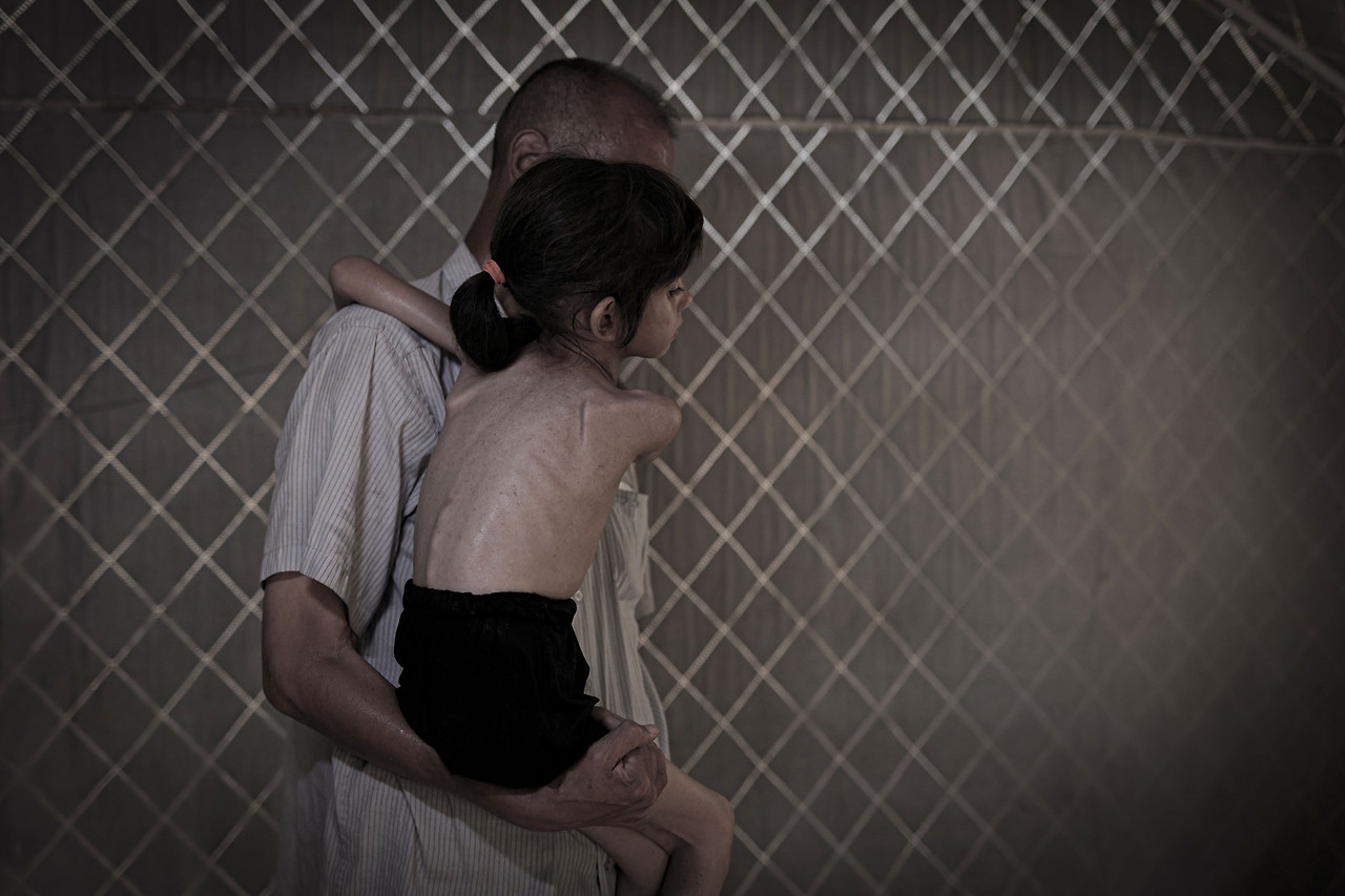 16. 가족과 함께 가자지구 Shuja'iyya지역에서 도심으로 도망친 5살 Lana Salih Juha는 2025년 7월 28일에 심각한 영양실조를 앓고 있다.