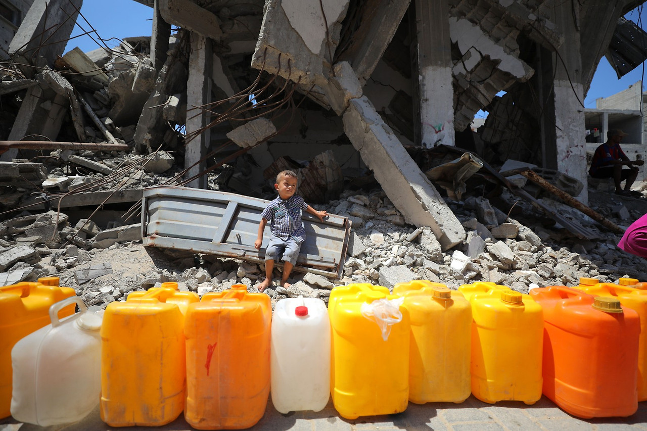 10. 2025년 7월 20일 가자지구 텐트로 다시 운반할 깨끗한 물을 모으기 위해 Nuseirat난민촌 주민들이 매일 급수차 앞에 줄을 서고 있다.