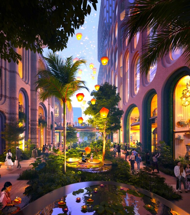 개방된 공공 공간이 포함될 것이다. 이는 작은 그늘 있는 광장, 랜턴,공원, 연못,부티크,사원 및 야외 시장이 있는 도시 마을로 위치하며, 대부분은 복원된 운하와 인접해 있다.