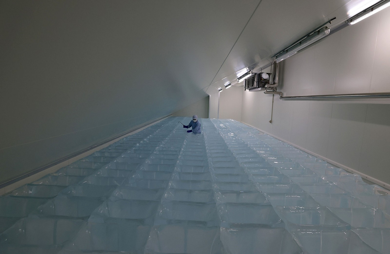 16.2025년 7월 28일 일본 다이시의 혼다 레이조 회사 공장에서 한 작업자가 큰 얼음 블록을 옮기고 있다. 일본 전역에 불볕더위가 지속되면서 얼음