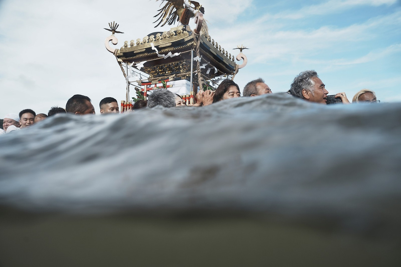 15. 2025년 7월 27일, 일본 요코스카에서 열리는 연례 구리하마 스미요시 신사 축제에서 참가자들이 미코시를 바다로 운반하고 있다.
