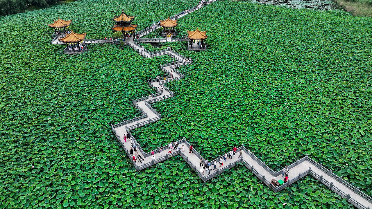 8.2025년 7월 26일 중국 구이저우 성의 첫신난 부예이 및 먀오 자치주에 있는 국가 습지 공원에서 관광객들이 큰 연꽃과 녹색 잎의 경치를 즐기고 있다.