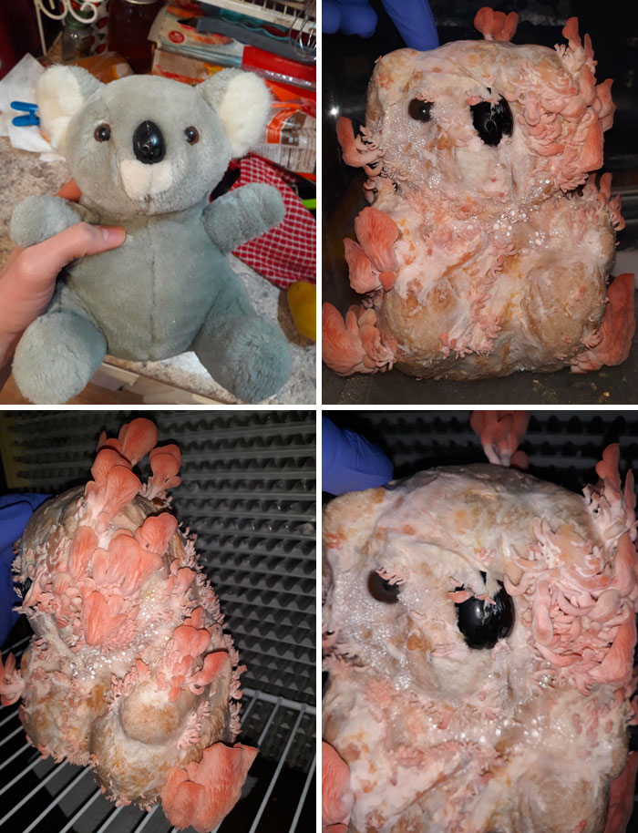 48.버섯이 곰인형에서 자라고 있다.