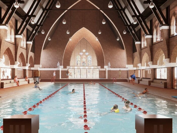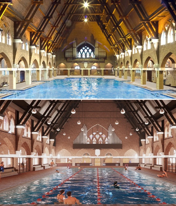 예를 들어, 오래된 교인석은 수영하는 사람들을 위한 좌석과 관중을 위한 바 테이블이 될 것이고, 이전의 강단은 수영장 구조물으로 사용될 것이다.