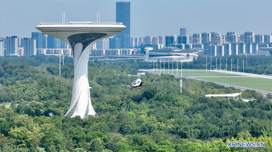 4.안후이(安徽)성 허페이시 뤄강(駱崗)공원에서 비행 시뮬레이션 중인 전동수직이착륙기(eVTOL)를 드론에 담았다.