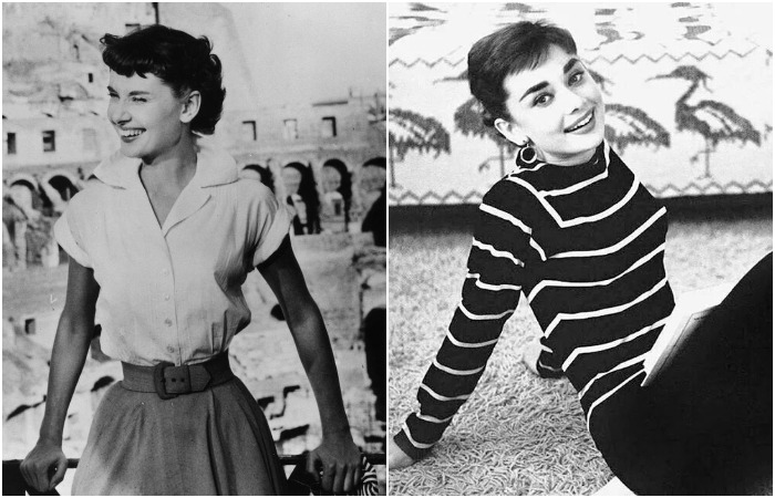반대로 실루엣을 늘리고 날씬하게 만든다는 것이다.여배우는 하의로 수직 줄무늬 바지를 선택하여 다리가 길어 보이도록 했고, 상의로는 얇은 수평 줄무늬가 있는 옷을 선택하여 상체에 볼륨을 추가했다. 이미지를 과도하게 부담스럽게 만들지 않기 위해 오드리는 항상 줄무늬 상의를 단색 하의와 조합했으며, 그 반대도 마찬가지였다. 또한 그녀는 이러한 의상에 힐이나 화려한 액세서리를 잘 포함하지 않았는데, 그 이유는 프린트 자체가 이미 화려한 요소이기 때문이다.