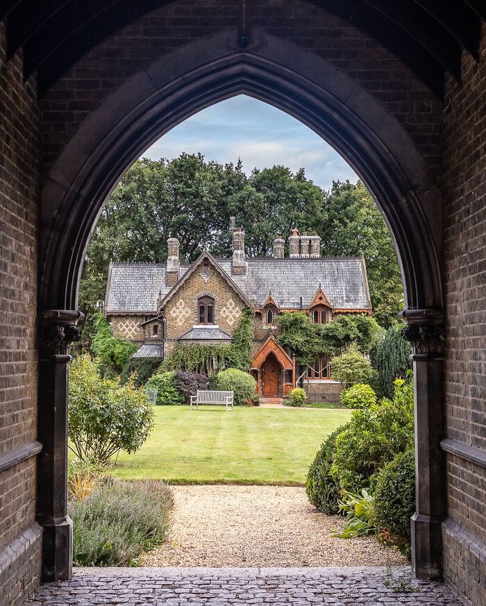 7.19th-Century Victorian Gothic Cottage Framed By The Arched Gatehouse In Holly Village, Highgate, North London, UK