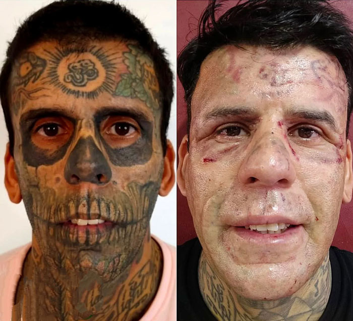 그는 이후 레이저를 사용하여 얼굴에 있는 대부분의 타투를 제거했으며,부풀고 원초적이며 고통스러워 보이는 결과를 그의 인스타그램 계정에 게시했다.