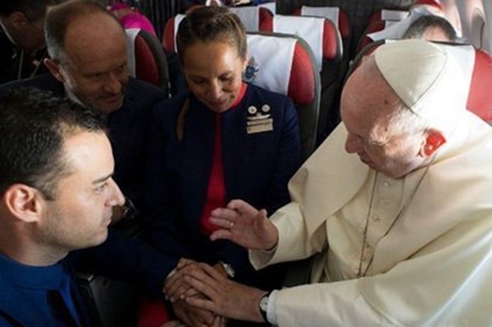 승무원 중에는 오랫동안 연인 관계를 유지해왔고 자녀까지 있는 두 명의 승무원이 있었다. 이들은 최근 결혼을 계획했지만,결혼식을 치르기로 한 교회가 지진으로 파괴되고 말았다. 이에 두 사람은 용기를 내어 교황에게 비행기 안에서 직접 결혼시켜 달라고 요청했다. 교황에게는 처음 있는 일이었지만,