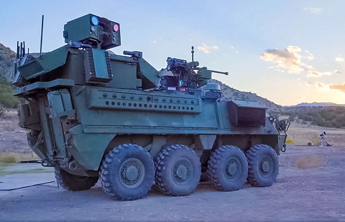 새로운 Stryker는 무장 능력이 탁월하며, 각각의 무기는 명확한 목적을 가지고 있다. 중심에는 블루헤일로(BlueHalo)의 26킬로와트 LOCUST 전투용 레이저가 있다. 수납 가능한 마스트에 장착되어 360도 사격이 가능하며, 이미 뉴멕시코에서 진행된 테스트에서 모든 드론 무리를 성공적으로 격추시키며 효과가 입증되었다. 주요 장점은 즉시 목표 타격이 가능하고 사실상 무한의 탄약을 사용할 수 있다는 점이다. 각각의 발사는 거의 비용이 들지 않아 저가 드론의 대규모 공격에 이상적인 무다. 그러나 이 무기에도 약점이 있다. 폭우, 안개, 연기는 그 효과를 크게 감소시키거나 아예 쓸모없게 만들 수