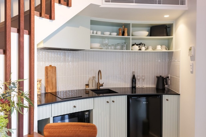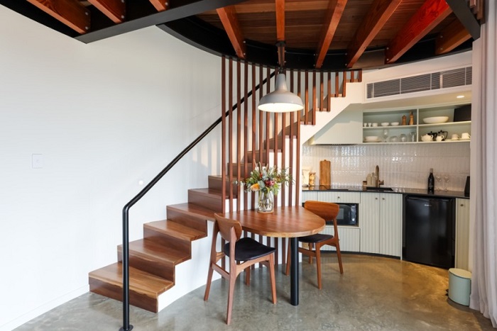 주방은 복원 중인 빅토리아 주택에서 회수한 재활용 목재로 만든 조각 같은 계단 아래에 예술적으로 숨겨져 있다. 반원형 공간에는 비슷한 형태의 주방 캐비닛이 배치되어 있어 수납 공간과 조리대, 통합 가전제품을 제공한다. 계단의 높은 나무 난간 옆 식사 공간에는 Amber가 오래된 헛간에서 발견한