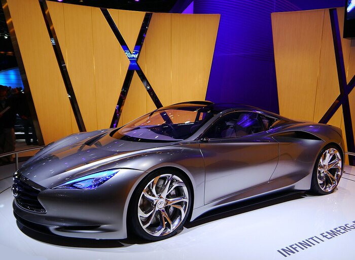 2012년에 Infiniti Emerg-E가 공개되었다 – 두 개의 전기 모터와 소형 가솔린 엔진-제너레이터가 장착된 하이브리드 차량이었다.