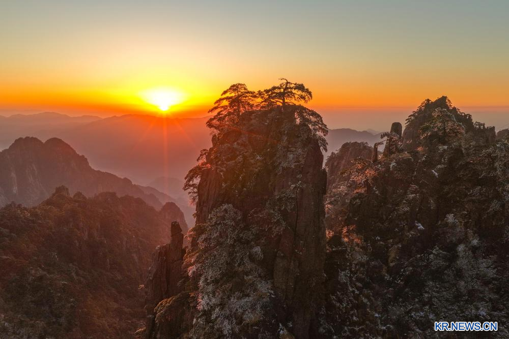 21.눈 덮인 안후이(安徽)성 황산(黃山) 풍경구의 일출 풍경