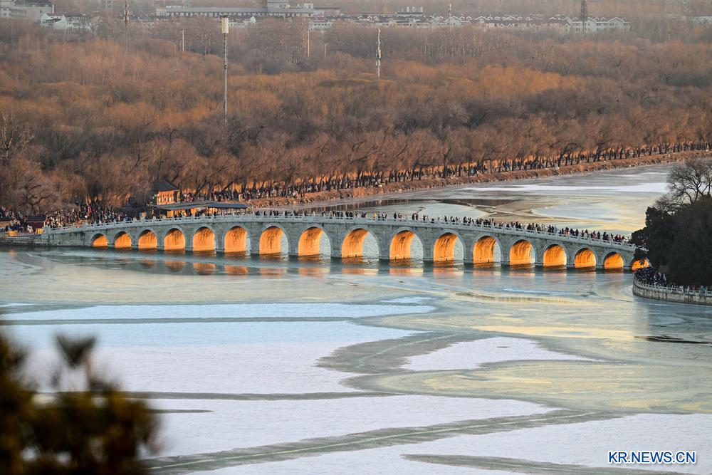 23.절기상 동지(冬至)인 21일, 석양이 베이징 이화원(頤和園) 십칠공교(十七孔橋)를 비춰 뿜어져 나온 '금광천동(金光穿洞)'의 경관