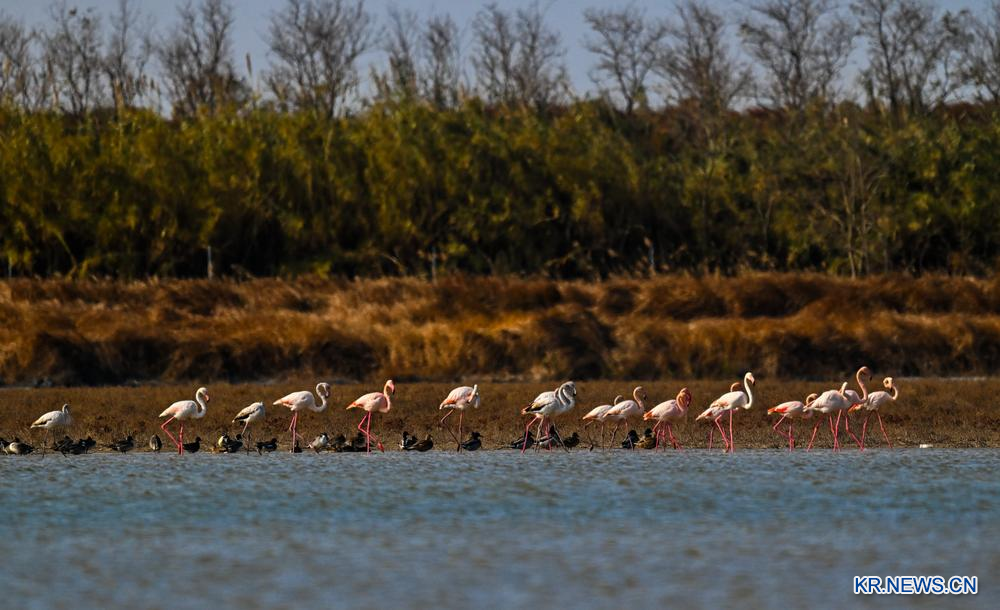 23.홍학 무리가 잇따라 장쑤(江蘇)성 둥타이(東臺)시 탸오쯔니(條子泥)습지로 날아들고 있다.