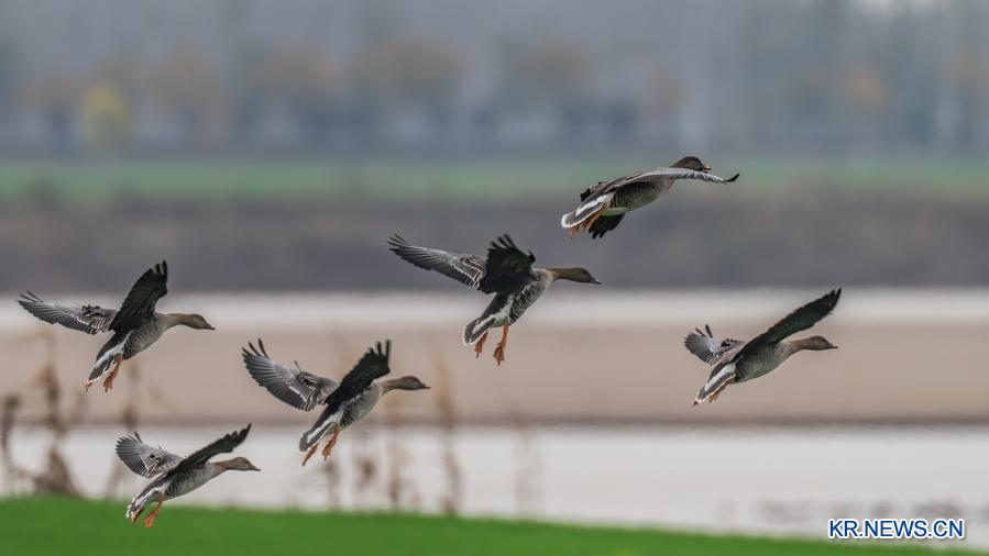 2.산둥(山東)성 허쩌(菏澤)시 둥밍(東明)현의 황허 개펄에서 포착한 기러기
