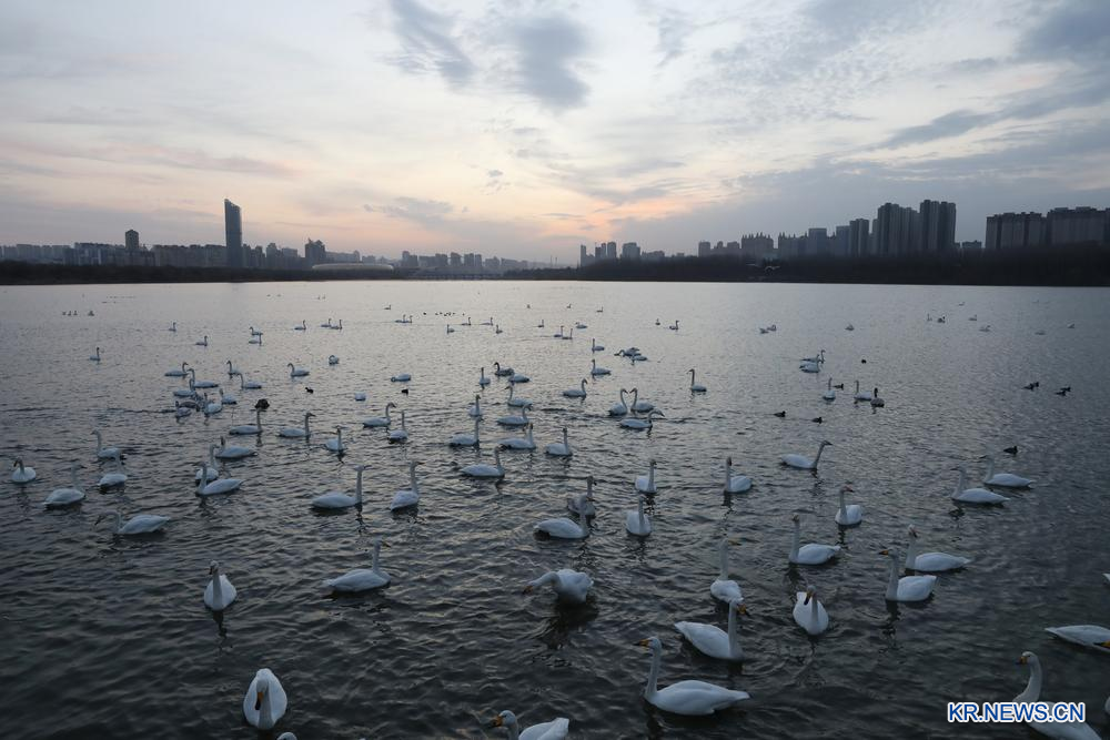 22.허난성 싼먼샤(三門峽)시 톈어후(天鵝湖)국가도시습지공원에서 촬영한 백조떼