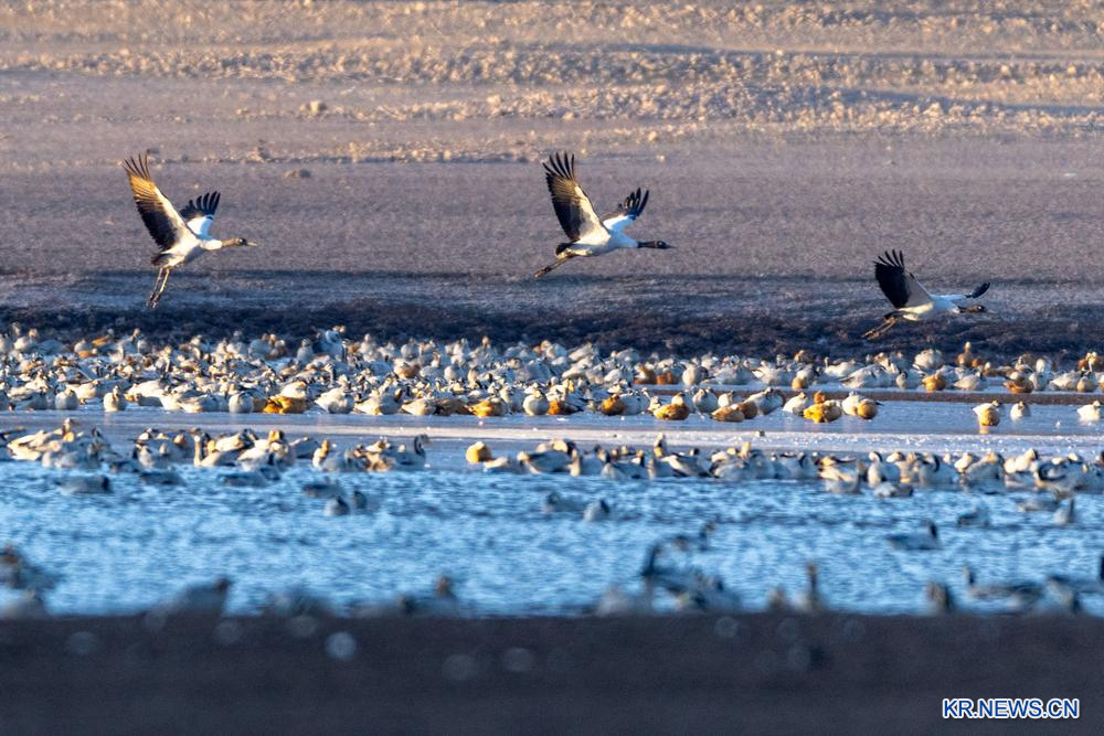 8.시짱(西藏)자치구 라싸(拉薩)시 린저우(林周)현에 검은목두루미 등 월동 철새들이 모여들고 있다.