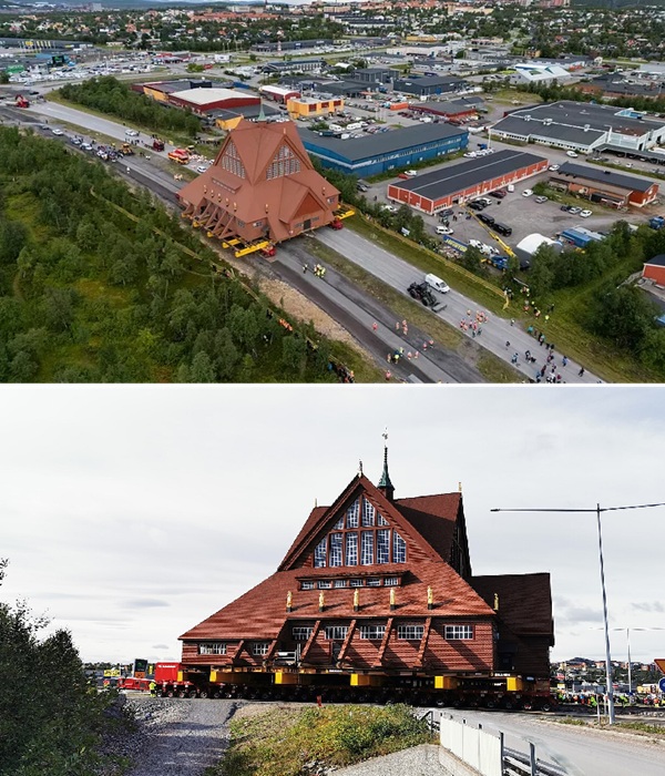 건물 그대로 5km거리에 이전한 스웨덴의 Kiruna교회