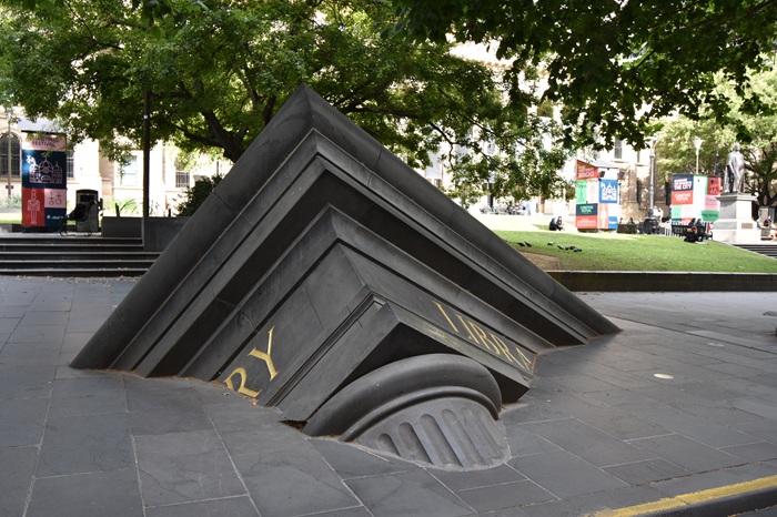 호주 Melbourne에서는 Victoria주립 도서관 옆에 일부 사람들에게는 불안감을 주는 예술 작품이 있다. 오래된 도서관이 지하로 가라앉았거나 모래