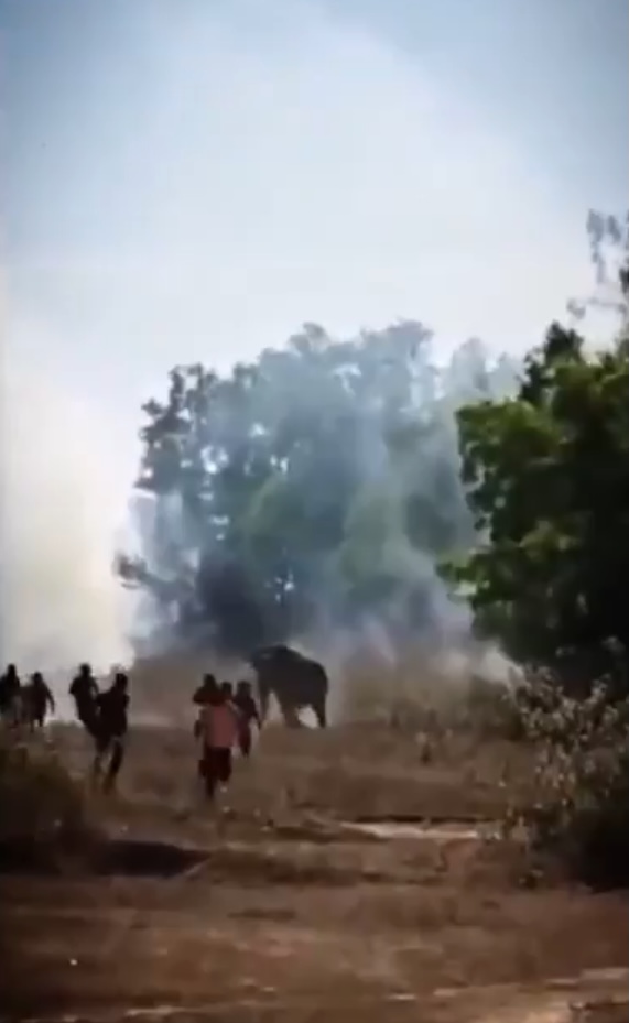 1.동부 인도의 한 마을에서 광란을 벌이는 날것의 수컷 코끼리가 위에서 보인다.